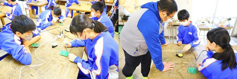 6組は技術の授業で、ハンダ付けを行っていました。やけどしないように、そしてきれいにハンダ付けできるように行っていました。