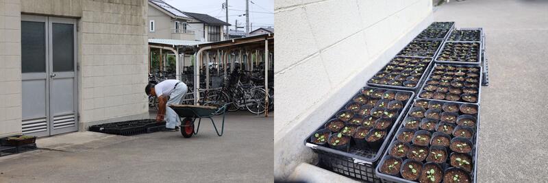 技能主事の伊藤さんが、芽がでた苗を光に当てていました。これは何の苗でしょうね。