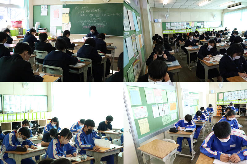 3組は数学の授業で、平行と合同の単元テストを行っていました。証明も少しずつかけるようになっています。