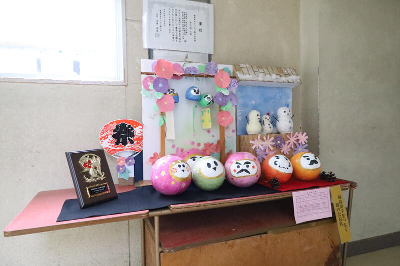 4校時廊下を歩いていると、かわいいだるまが並んでいました。11組と12組の生徒が協働でつくった「季節のだるま」という作品でした。雪だるまだけでなく季節のかわいいだるまを作ったそうです。福島市の福島市福祉作品展で福島市手をつなぐ親の会長賞をいただいた作品でした。