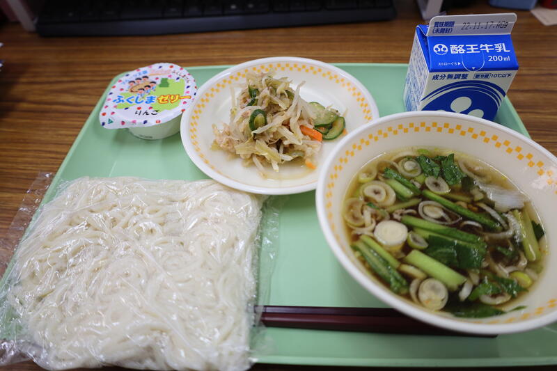 ソフト麺、肉うどん、すき昆布ともやしのサラダ、りんごゼリー