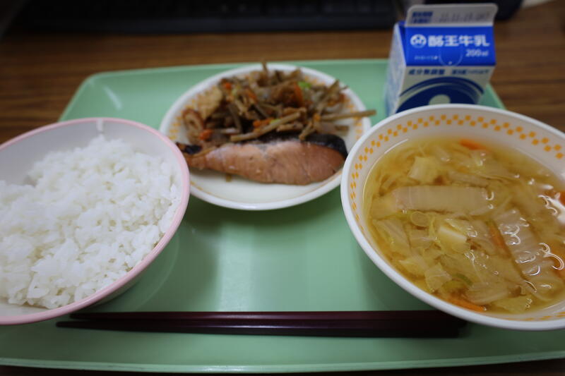 ご飯、鮭の照り焼き、野菜きんぴら、白菜のみそ汁