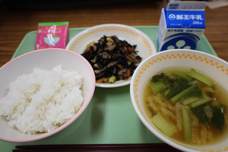 ご飯、ひじきのいそ煮、大根のみそ汁、ふりかけ