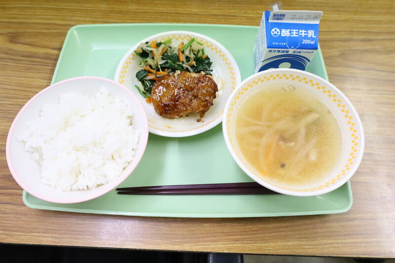 ご飯、チキンハンバーグ、ほうれん草のおひたし、じゃがいものスープ