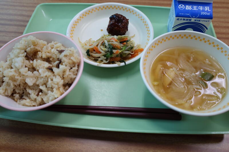 きのこご飯、肉だんご、和風胡麻サラダ、玉ねぎと油揚げのみそ汁