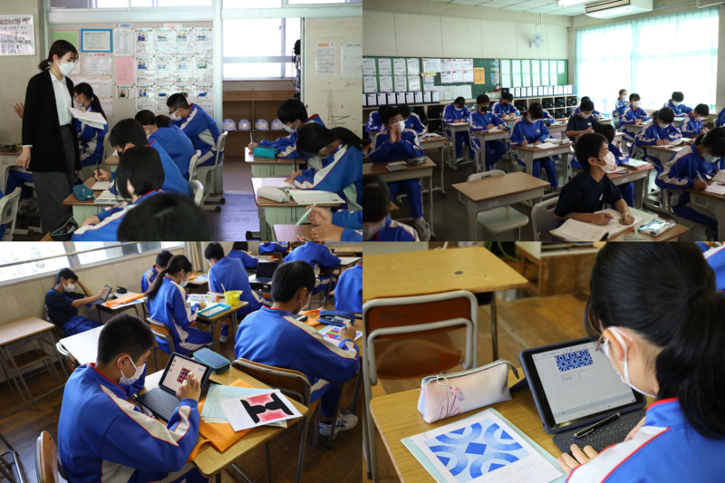 6組は美術の授業で、完成した図をタブレットに取り込んでいました。その後、パターンの図柄を作り、物の上にデザインしていました。
