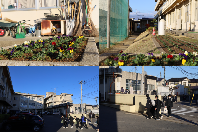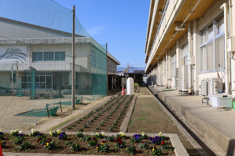 冬の寒さに近づいていますが、校舎前の花壇ではパンジー、ビオラが元気に育ってきています。