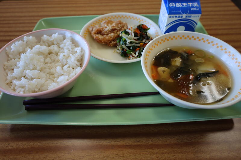 麦ご飯、とりのから揚げ、いそ和え、わかめのみそ汁