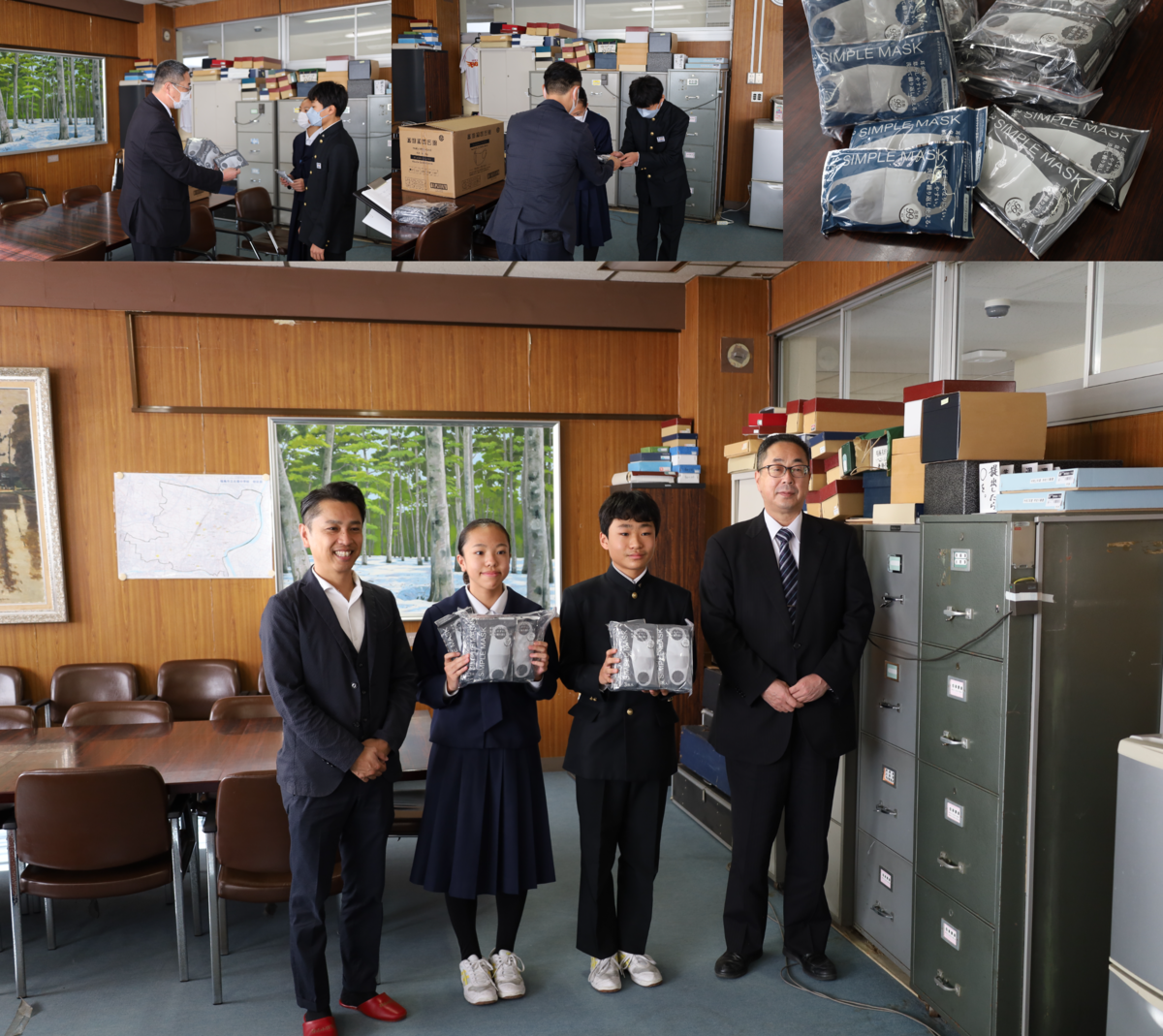 保護者でもあるエイチアイシーの原さんよりマスクの寄贈がありました。生徒会長と生徒会副会長が受け取らせていただきました。感染状況も拡大傾向にあり、学校でも感染拡大予防対策を行っています。今回,いただいたマスクも感染拡大予防のために活用していただけるよう、全生徒と教職員に月曜日に配付いたします。マスクを寄贈していただき,本当にありがとうございました。