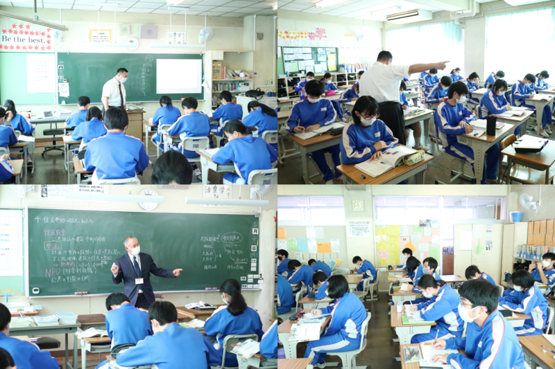 1組は社会の授業で、武士の政治について学んでいました。小学校の頃の学習内容を復習しながら、中世と近世の武士の時代は何が違うかについて考えていました。