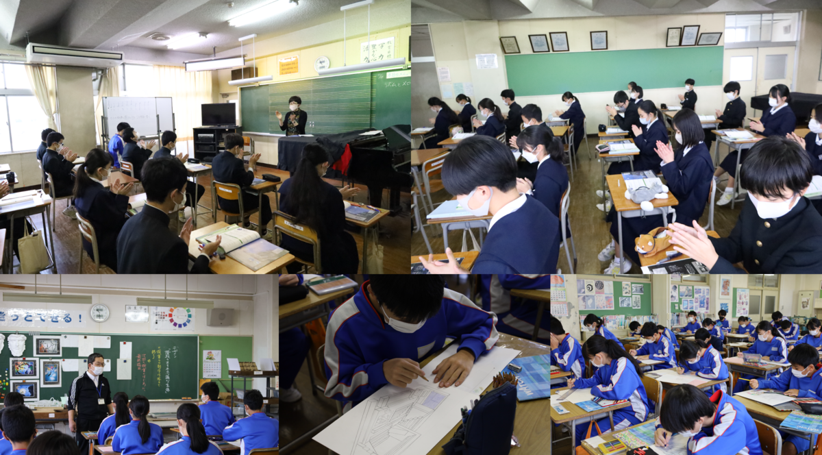 2組は音楽の授業で モーリス・ラベルのボレロの鑑賞を行っていました。この曲にはどんな魔術がかけられているかなど、曲の見方・考え方を示しながら進めていました。