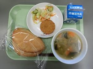 今日の給食メニューは、サラダパン、牛乳、ハムチーズフライ、コーンサラダ、マカロニスープです。ハムチーズフライは、サラダパンに挟んで食べました。658キロカロリーです。