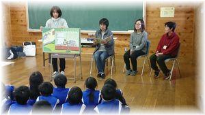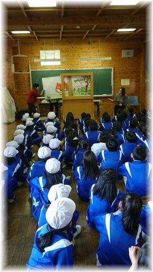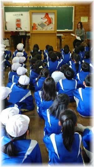 1・2年生への読み聞かせ。「はらぺこおおかみとぶたのまち」と大型紙芝居で「ハガネのは」の読み聞かせをしていただきました。