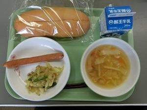今日の給食メニューは、切れ目入りパン、ケチャップ&マスタード、牛乳、フランクフルト、じゃがいものカレーソテー、白菜のスープでした。640カロリーです。