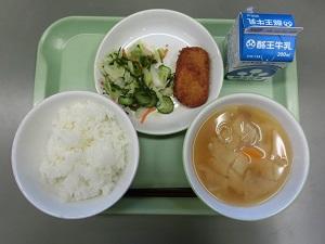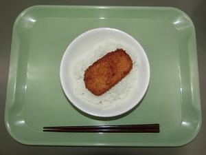 今日の給食は、「会津地方の献立」です。メニューは、ごはん、牛乳、ソースカツ、浅漬け、車麩のみそ汁でした。会津と言えばソースカツ丼です。ソースカツをごはんに乗せていただきました。今日のカロリーは、632キロカロリーです。