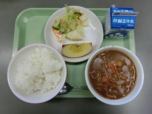 今日は、「かみかみ献立」でした。メニューは、ごはん、牛乳、フレンチサラダ、ポークカレー、りんごでした。693カロリーです。
