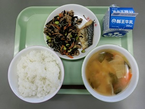 今日の給食は「和食の日」。和食の日メニューは、ごはん、牛乳、さばの塩焼き、ひじきの炒め物、しみ豆腐のみそ汁でした。676カロリーです。