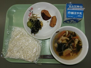 今日の給食のメニューは、ソフト麺、牛乳、大学いも、海藻サラダ、肉うどんかけ汁でした。646カロリーです。