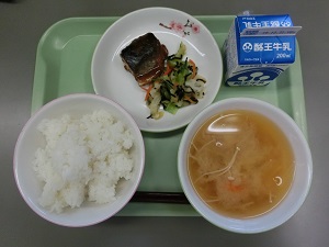 今日の給食は、週に1度の「和食の日」です。メニューは、ごはん、牛乳、さばのみそ煮、いそあえ、えのきのみそ汁でした。626カロリーです。