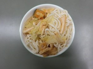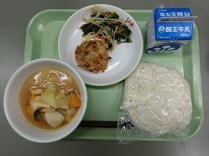 今日の給食メニューは、ソフト麺、牛乳、大豆入りかき揚げ、おひたし、ほうとううどんかけ汁でした。634カロリーです。