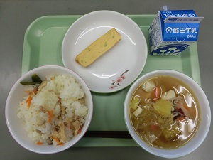 今日の給食は、秋の味覚の栗やさつまいもを使ったメニューです。ごはん、牛乳、枝豆入り卵焼き、栗五目ごはんの具、さつま汁でした。683カロリーです。