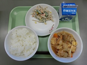 今日の給食は、ごはん、牛乳、ごぼうサラダ、生揚げの中華煮でした。665カロリーです。