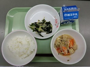 今日の給食メニューは、ごはん、牛乳、わかめのピリ辛あえ、豚肉のすき煮でした。603Cal です。
