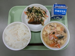 今日の給食は「和食の日」献立です。メニューは、牛乳、ごはん、さばのカレー煮、凍み豆腐のごまあえ、すまし汁でした。671カロリーです。
