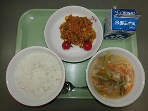 今日の給食メニューは、ごはん、牛乳、ドライカレー、ミニトマト(2個)、コンソメスープでした。