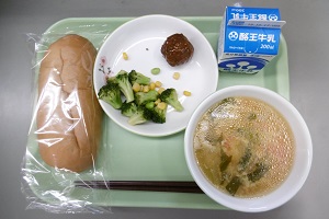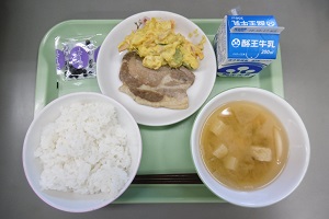 明日は10月10日「目の愛護デー」です。それにちなんで今日の給食は「目の愛護デー献立」でした。メニューは、ごはん、乾燥ブルーベリー、牛乳、豚肉の生姜焼き、かぼちゃサラダ、あさりのみそ汁で、705カロリーでした。
