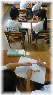長さを比べるにはどうしたら良いだろう。子供たちは試行錯誤しながら,比べるときに大切なことを考えていました。