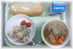 今日の給食はパン。ツナサンドと肉団子と野菜のスープ,ミニトマトです。