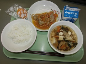 今日の給食のメニューは、ごはん、牛乳、鶏ごぼうスープ、豚肉のプルコギ、冷凍ピーチコンポートでした。プルコギは韓国で有名な肉料理で「韓国風すきやき」と言われているそうです。
