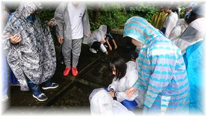 2日目はあいにく雨が降ってしまいましたが,合羽を着て探検をしました。