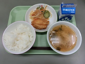 今日(28日)は、2学期になってはじめての給食でした。献立は「8月生まれのお誕生日お祝い献立」で、蓬莱東小学校のお友達が考えてくれました。メニューは、ごはん、牛乳、鶏から揚げ、中華サラダ、にら豚みそ汁です。たくさん食べて、元気に8月を乗り切ってほしいです。8月生まれの皆さん、お誕生日おめでとうございます。