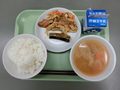 今日は火曜日「和食の日」です。給食のメニューは、ごはん、牛乳、さんまのオレンジ煮、ふきの炒め物、具だくさん汁でした。少し苦めのふきですが、体のむくみをとるなどの効果があるそうです。
