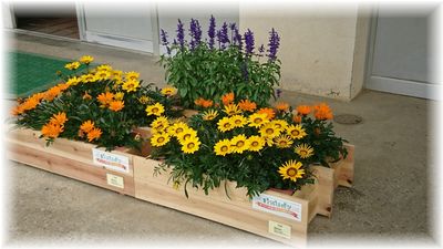 蓬莱小学校でもいただきました。昇降口では今,初夏の花が咲き誇っています。