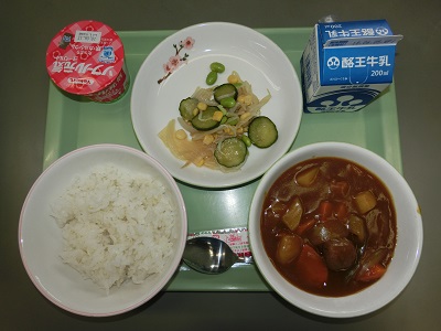 今日の給食は「お誕生日お祝い献立」です。メニューは、麦ごはん、牛乳、こんにゃくサラダ、ミートボールカレー、ヨーグルトでした。5月生まれの皆さん、お誕生日おめでとうございます!