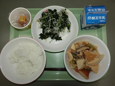 今日の給食は福島県の味めぐり「県北地方」の献立でした。メニューは、ごはん、牛乳、納豆、からしあえ、凍み大根とたけのこの煮物でした。地元の味、改めてじっくりと味わいたいですね。