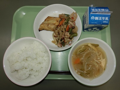 今日は週に1回ある和食の日です。お魚を中心にした「お魚献立」でした。メニューは、ごはん、牛乳、さばの塩焼き、れんこんのベーコン炒め、絹さやのみそ汁でした。