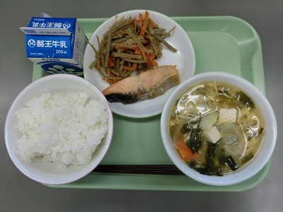 今日は、和食の日でした。給食のメニューは、ごはん、牛乳、甘塩鮭、五目きんぴら、にらたま汁でした。