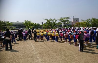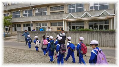 進級して教室も変わりましたので、新しい避難経路の確認を行いました。余震の恐れがあるための避難ということで、ランドセルを背負っての避難です。
