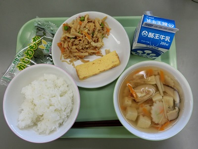 今日は5月になって、はじめての給食の日です。献立は「こどもの日献立」でした。メニューは、ごはん、牛乳、だし巻き卵、たけのこごはんの具、すまし汁、柏餅でした。今週末5日(土)はこどもの日、元気に大きく育つようにお祝いしてあげてほしいです。