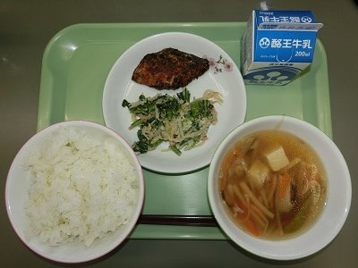 今日は火曜日「和食の日」です。給食メニューは福島市の料理で、さわらのたつたあげ、かぶれなのごまあえ、沢煮椀、ごはん、牛乳でした。