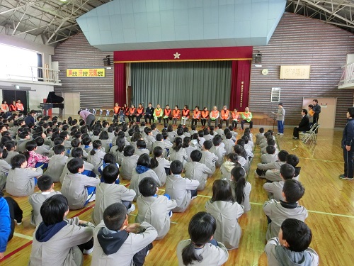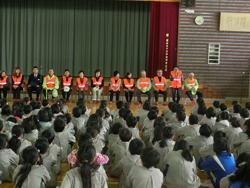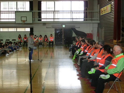 今日の全校集会では、見守りボランティア顔合わせの会を行いました。今年度、ボランティアで児童たちの登下校の安全を守っていただける皆さんに学校へ来ていただき、児童たちと顔合わせを行いました。協力してくださる地域の方に感謝するとともに、今年度よろしくお願い致します。