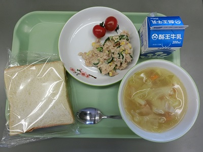 今日の給食のメニューは、食パン、牛乳、ツナサンドの具、キャベツとあさりのスープ、ミニトマトでした。久しぶりの食パンに喜んでいた児童が多くいました。
