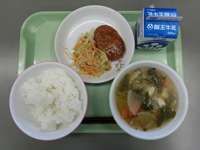 今日の給食は「4月のお誕生日お祝い献立」でした。メニューは、ごはん、牛乳、ハンバーグトマトソースがけ、春キャベツのレモンあえ、鶏ごぼうスープでした。4月生まれの皆さん、お誕生日おめでとうございます!!