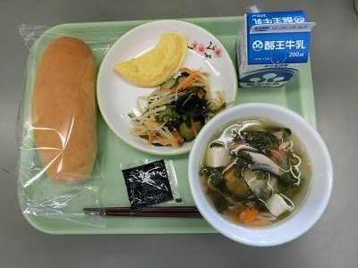 今日の給食メニューは、コッペパン、チョコレート、牛乳、オムレツ、海藻サラダ、ほうれん草のスープでした。