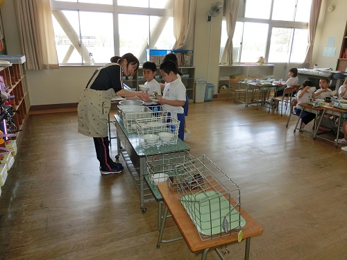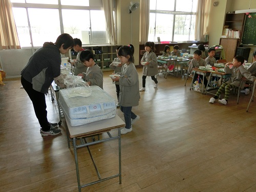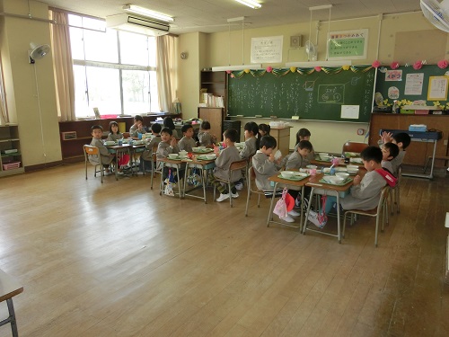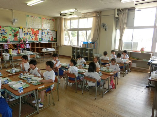 先日(12日)から、1年生の給食が始まりました。食器や牛乳、ごはん等の運び方、給食の分け方、もらい方、片付け方など初めてのことばかりで一つ一つ慎重にやり覚えようとする姿が見られました。そんな子どもたちも給食を食べているときは笑顔で、美味しい給食を食べていました。また、おかわりをする児童もいて、食べ終えたあとは満足そうでした。