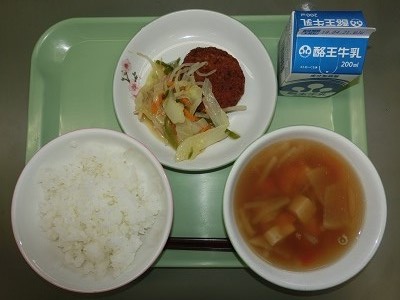 今日の給食のメニューは、ごはん、牛乳、れんこんカレーフライ、塩野菜炒め、根菜汁でした。1年生は今日も楽しく、美味しい給食をいただいていました。